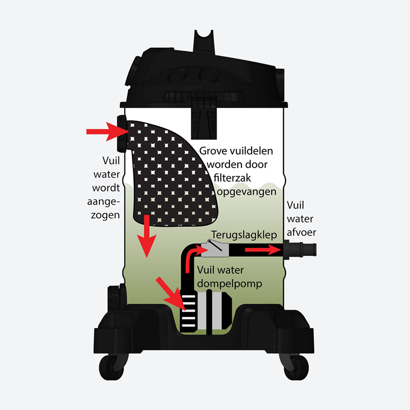 En verkligt effektiv dammsugare för både dammen och poolen, fungerar också bra till baddammar och våtsugning i hushållet. Dammsugaren suger utan avbrott, tack vare en integrerad tömningspump – dvs den suger och tömmer samtidigt. Det finns en stor pump i botten av dammsugaren som suger ut vattnet ur behållaren och transporterar vattnet vidare till en högre punkt eller över en mur eller ett staket ex.  I dammsugaren finns en nätkasse som tar upp all grovsmuts innan vattnet går in i tömningspumpen, nätkassen är smidig att tömma med hjälp av en grovtandad dragkedja. Den kan suga ned till 2 m, tack vare den effektiva motorn på 1200 W, och tömningspumpen är på 600 W, max tryckhöjd är 7 m. Det finns två transparenta sugrör och två för genomströmningskontroll och två sugrör. Dammsugaren har stora hjul undertill och det gör den lätt att förflytta, det finns även ett handtag. Kapaciteten är upp till 3000 liter/timma.