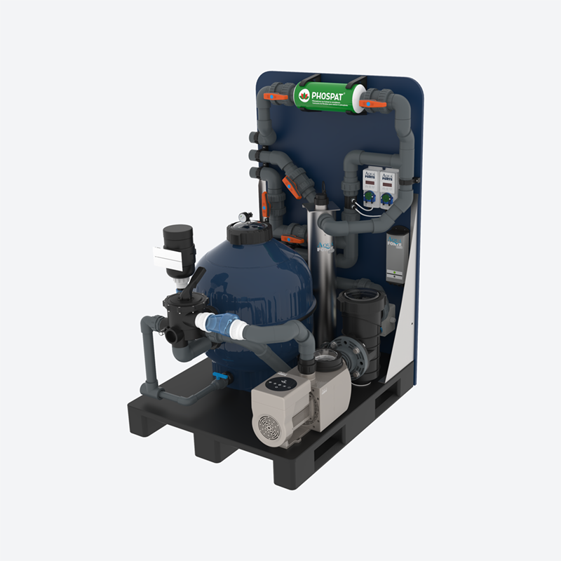 Den perfekta lösningen för professionell och kompakt biopoolfiltrering! Detta filtersystem levereras helt förmonterat på en plastpall med en HDPE-bakpanel. Endast strömkabeln behöver anslutas till kopplingsdosan. Detta filtersystem är lämpligt för biopooler på cirka 80 m³ eller (koi)dammar upp till 40 m³. Tack vare den självsugande pumpen kan systemet användas både ovan och under mark. Det behövs alltså inga stora växtfilter för att använda denna filteranläggning, men det hindrar inte heller och är alltså ingen nackdel. Fosfatpatronen som medföljer binder fosfater, som algerna är beroende av.